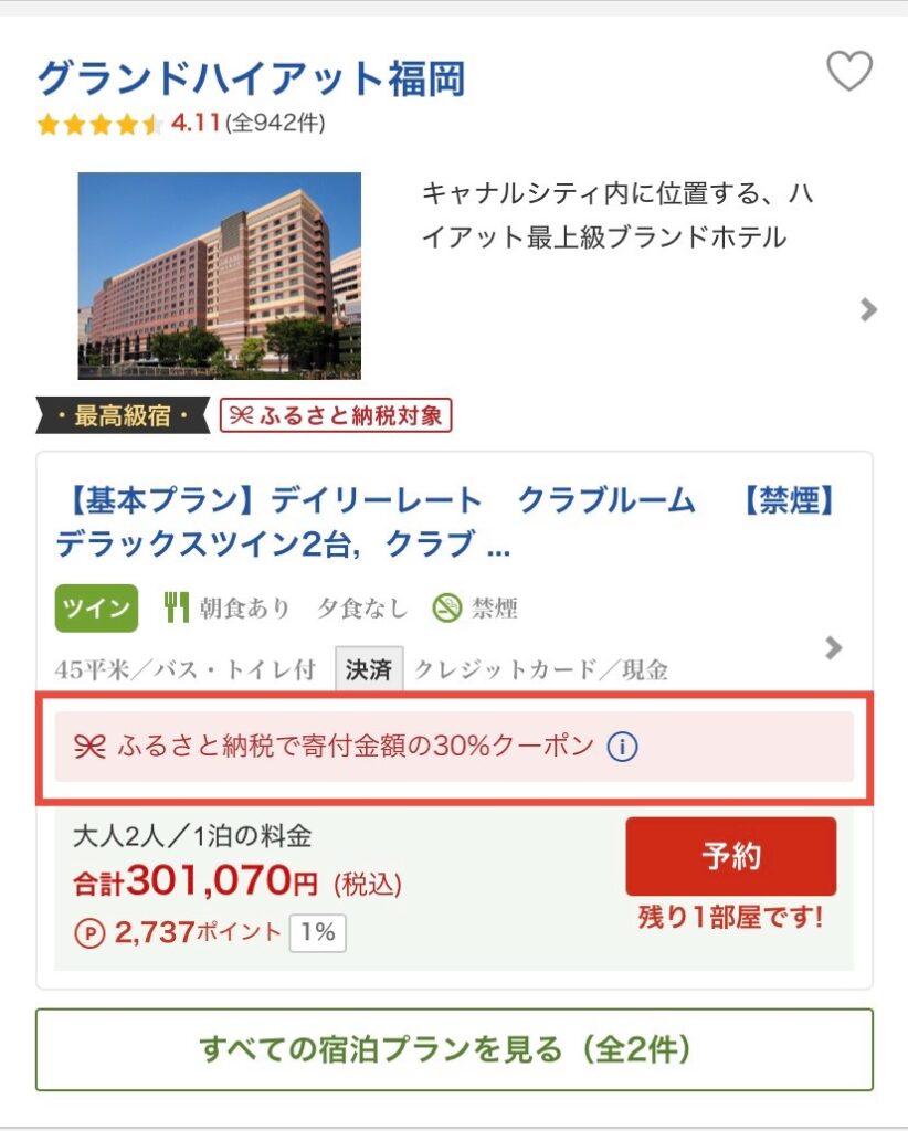 「グランドハイアット福岡」にお得に泊まりたい方は、ふるさと納税の宿泊クーポンを活用するのがおすすめです。