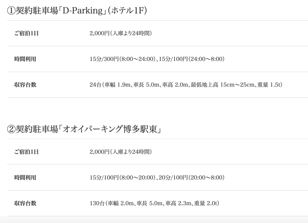 公式HPでは「D-Parking(ホテル1F)収容24台」と「オオイパーキング博多駅東 収容130台」の2つの契約駐車場が案内されていました。