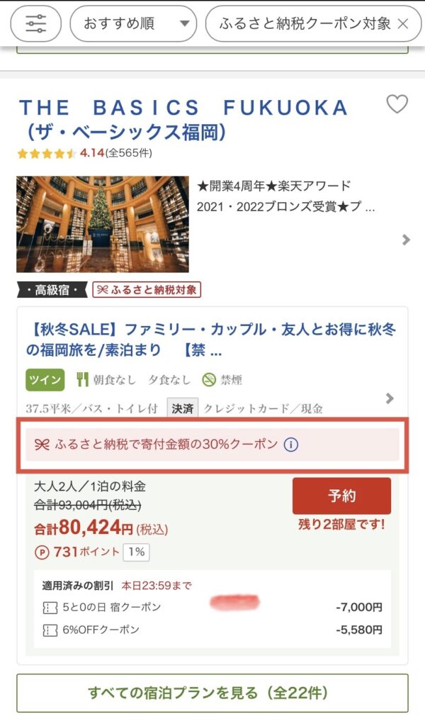 「THE BASICS FUKUOKA」にお得に泊まりたい方は、ふるさと納税の宿泊クーポンを活用するのがおすすめです。